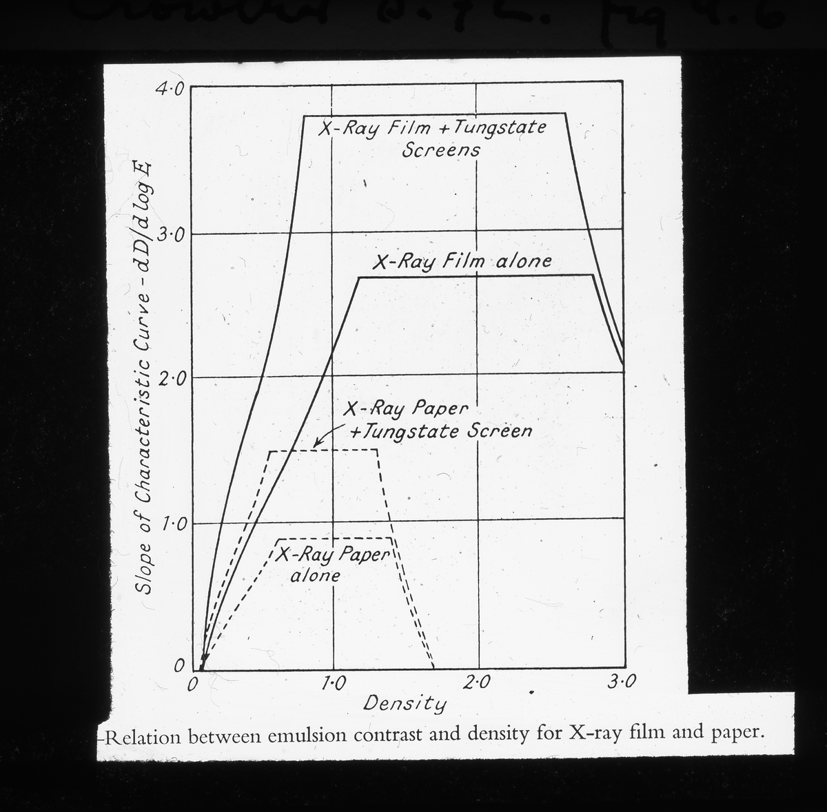 Sambandet mellan emulsionskontrast och densiteten för röntgenfilm och papper.