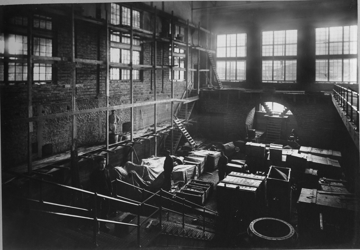 Byggandet av elektricitetsverket i Kirkenes, Norge. Grunden för var ångturbinens generatorer kommer att stå. Fotografiet ingår i ett album från AB de Lavals Ångturbin, 1909. "The Power Station of Aktieselkabet Sydvaranger i Kirkenes".