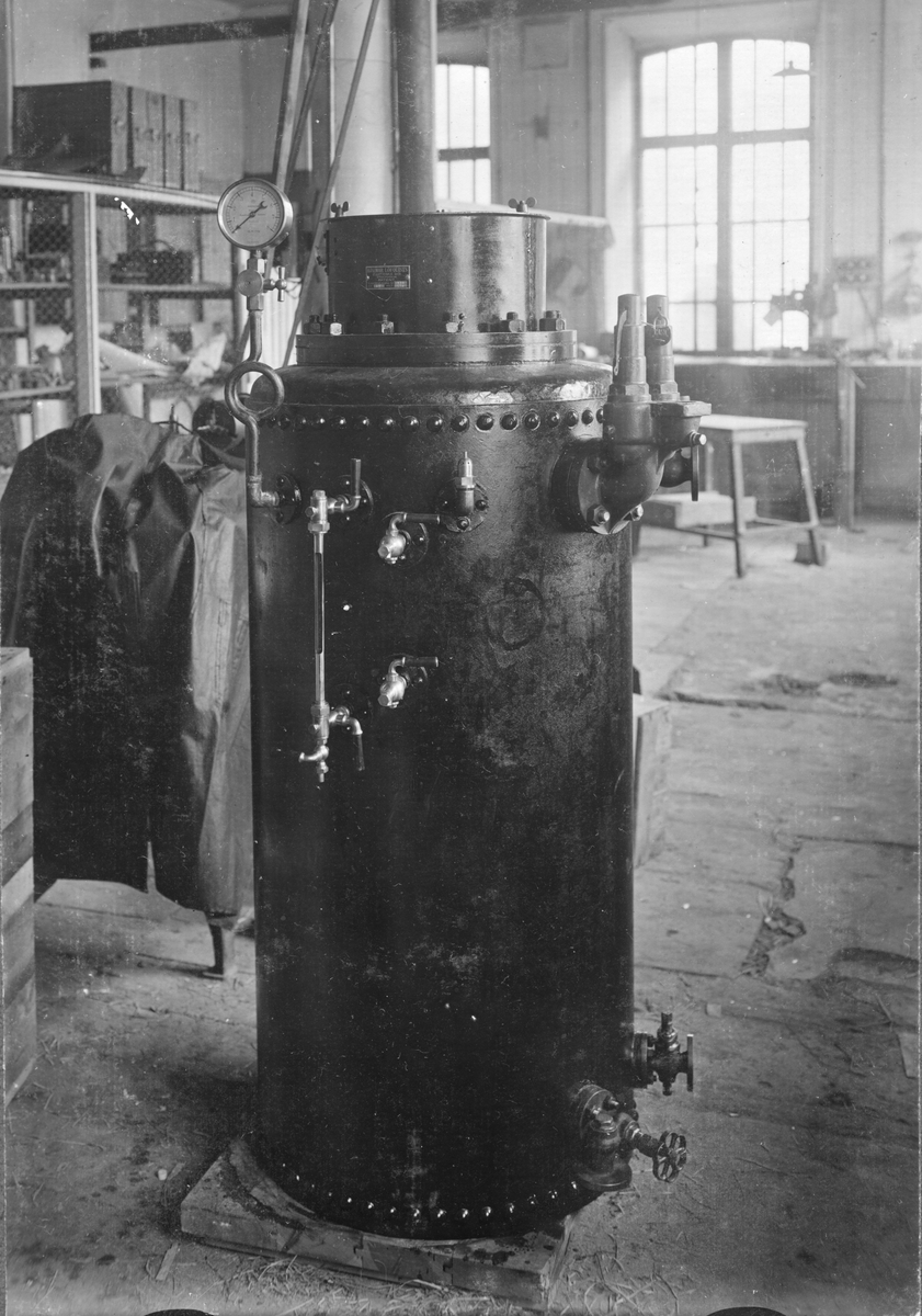Fotografi ur album av Hjalmar Löfquists patenterade elektriska ång- och varmvattenpannor, för industrier, kraftverk och bostäder. 20 k.w. 2 atm. 125, Scania Vabis Moss.