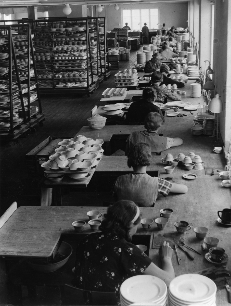 Handmålning av kaffekoppar vid Gustavsbergs Porslinsfabrik, dekorationsavdelningen.