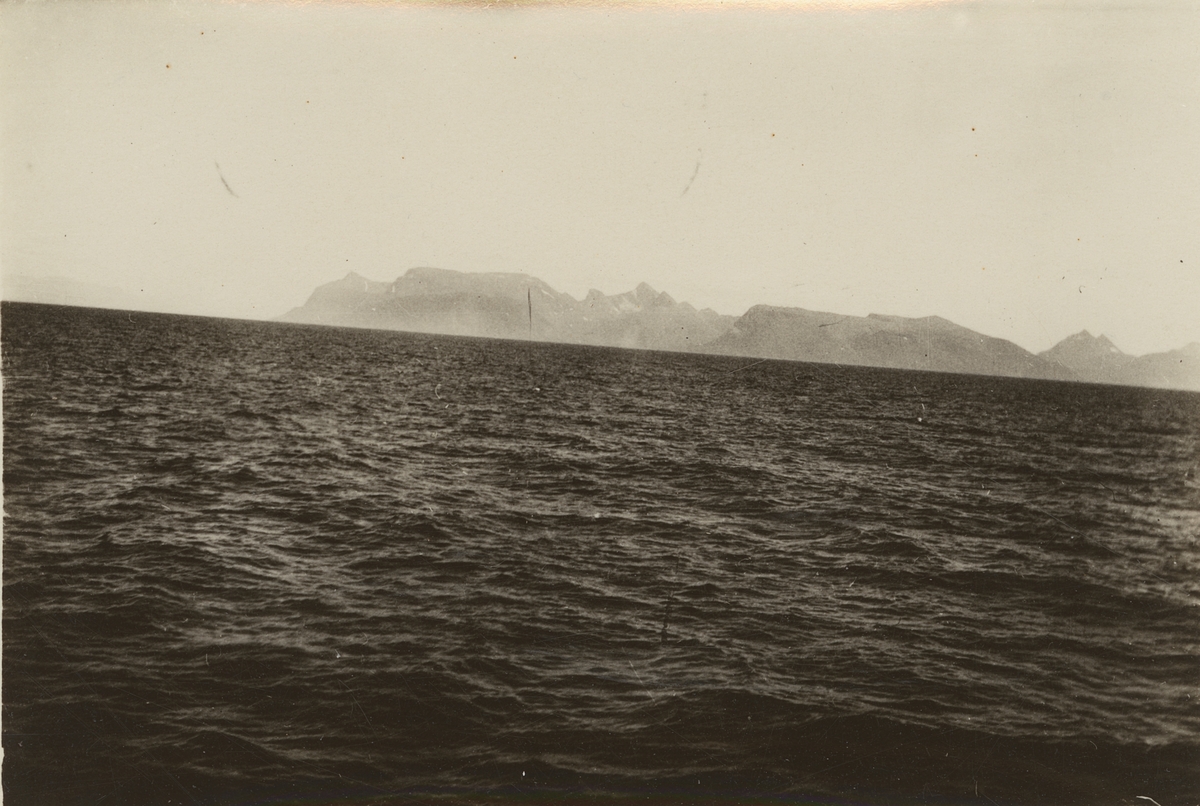 Fotografi från expedition till Spetsbergen. Vy över ett vidsträckt hav med berg i bakgrunden.