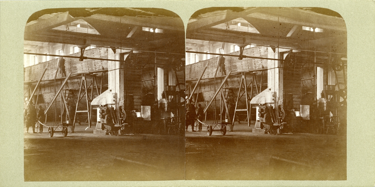 Plåtslagarverkstaden med vy av nya båtskjulet, Motala Mekaniska verkstad.