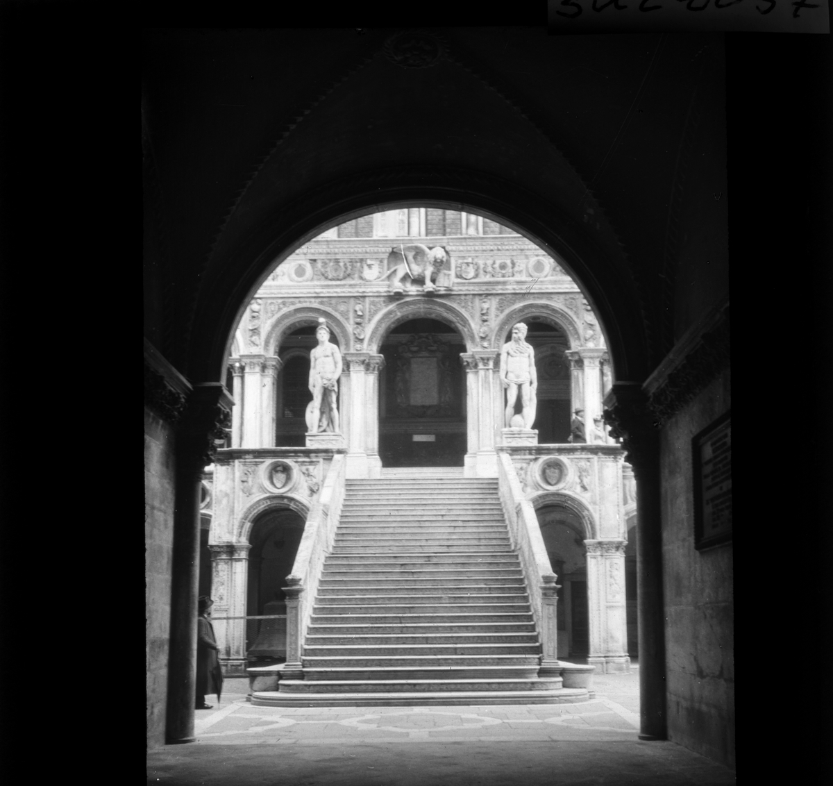 Skioptikonbild från institutionen för fotografi vid Kungliga Tekniska Högskolan. Motiv föreställande portal med trappa. Bilden är troligen tagen av John Hertzberg under en resa i Europa.
