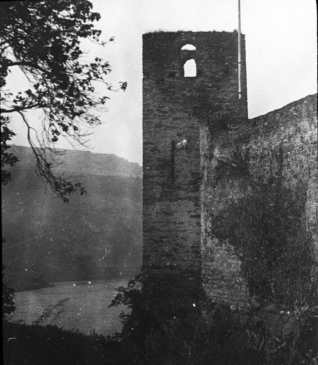 Skioptikonbild med motiv av torn i slottsmuren, slottet Schoenburg, Oberwesel.