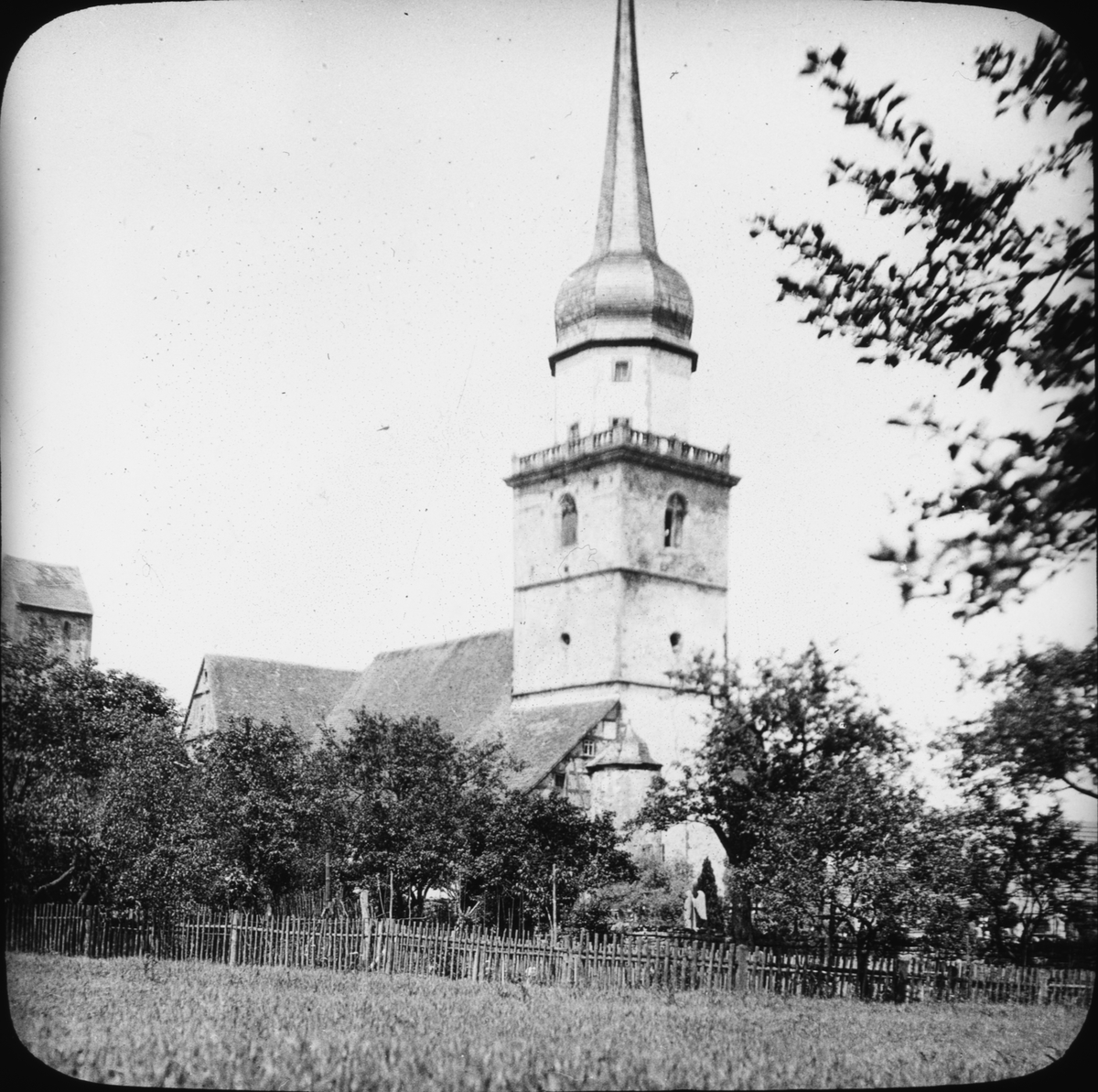 Titel: Skioptikonbild med motiv av Sankt Kilian kirche, Fladungen. Bilden har förvarats i kartong märkt: Vårresan 1910. Fladungen 9. IX.