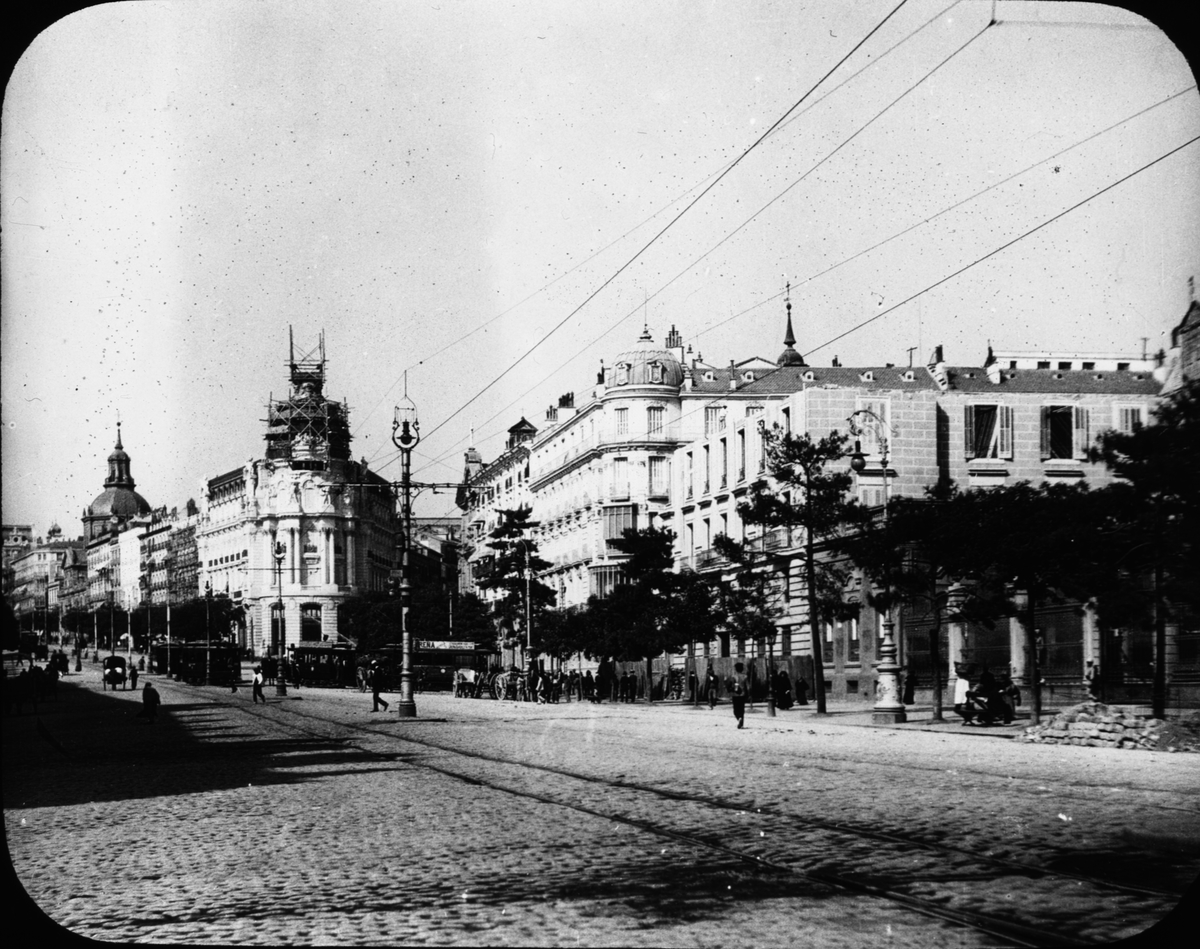 Skioptikonbild med motiv av Calle de Alacalá, den längsta gatan i Madrid.