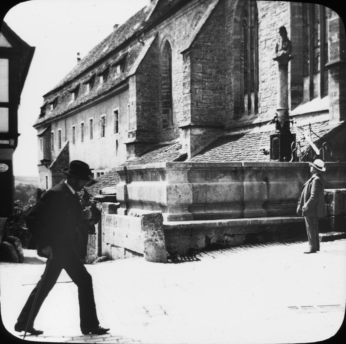 Skioptikonbild med motiv av man utanför Johannis Kirche, Rothenburg.