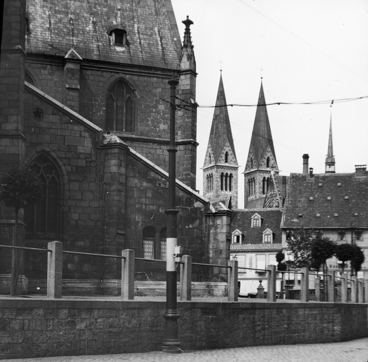 Skioptikonbild med motiv från Halberstadt med tornen på Halberstadt Dom i bakgrunden.