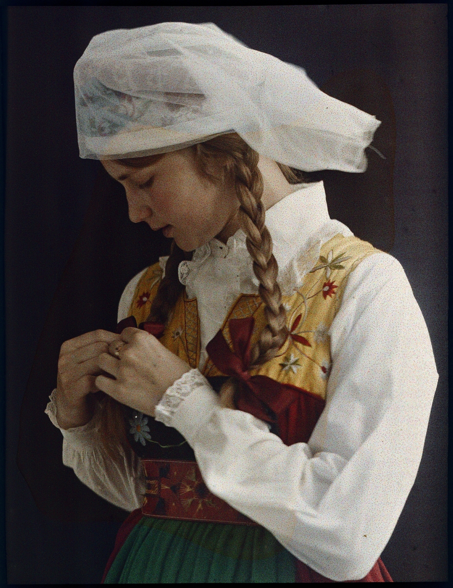 Titel: Agfa-autokrom. Serie "Margit". Porträtt av flicka i vingåkersdräkt.