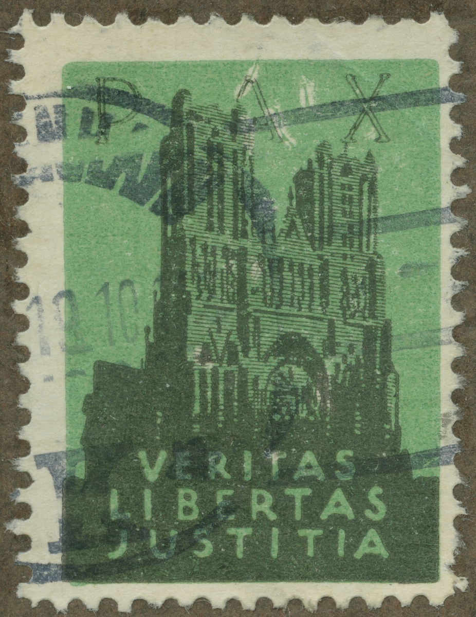 Frimärke från Frankrike,1919. Motiv av katedral. Text: "PAX" samt "Veritas - Libertas - Justitia".