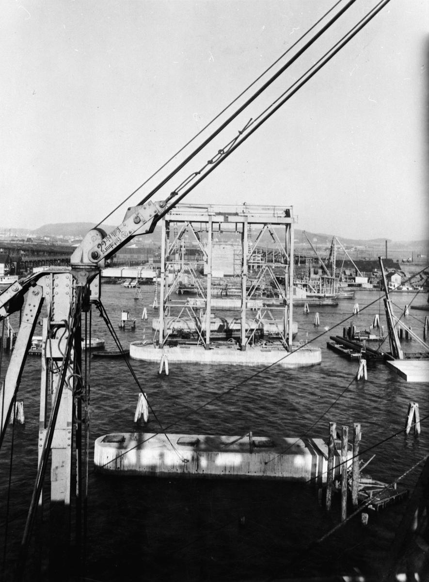 Byggherre: Byggnadsaktiebolaget Contractor, Stockholm. Götaälvsbron. Arbetsbild med delvis färdiga bro pelare ute i älven.