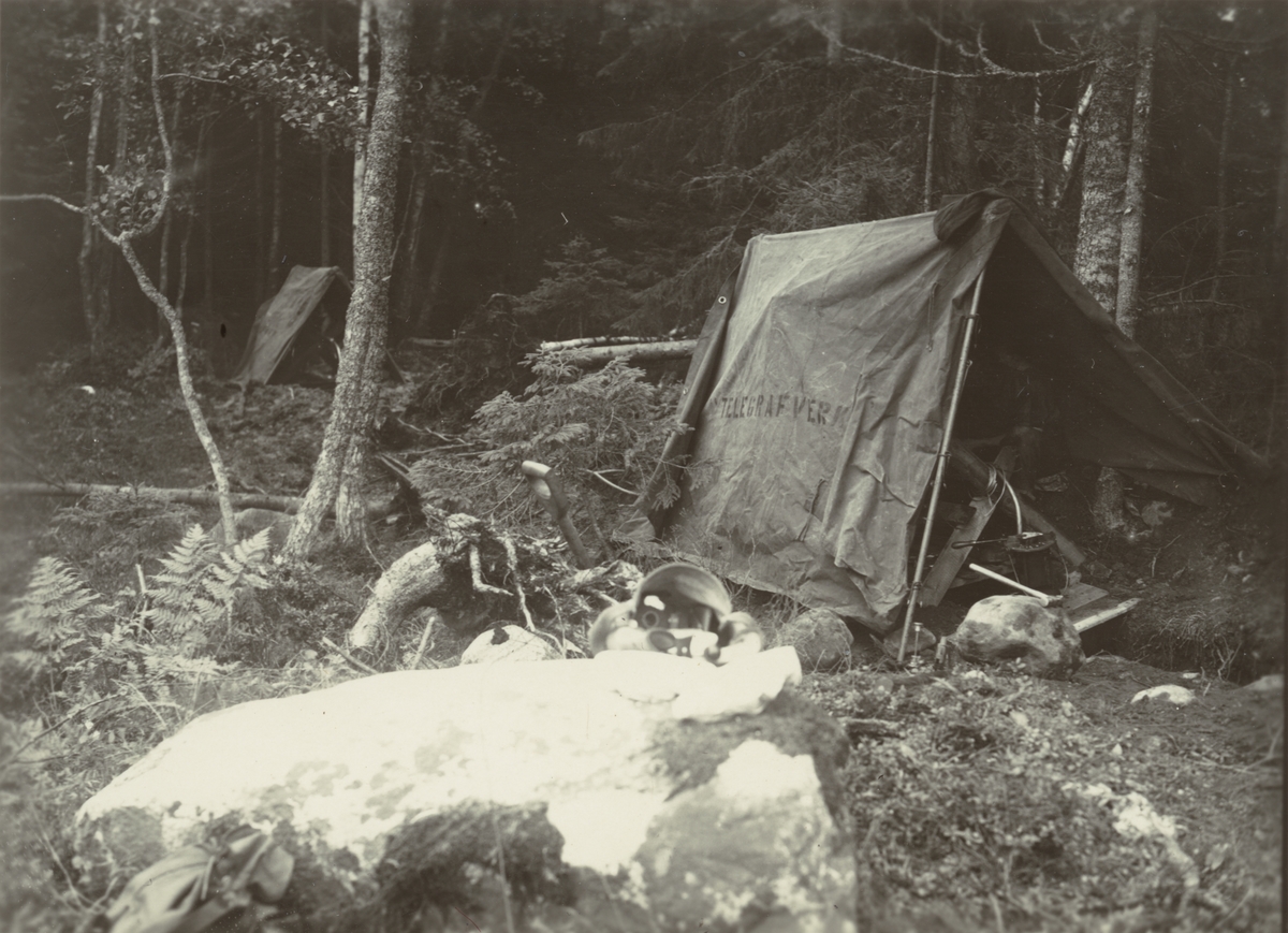 Finnvikskabeln. Skarvning i Räfsnässkogen. Ur albumet Kabelarbetet Hjälmsälra (Hjälmsättra) - Norrtälje - Finnviken utfört under sommaren 1928.