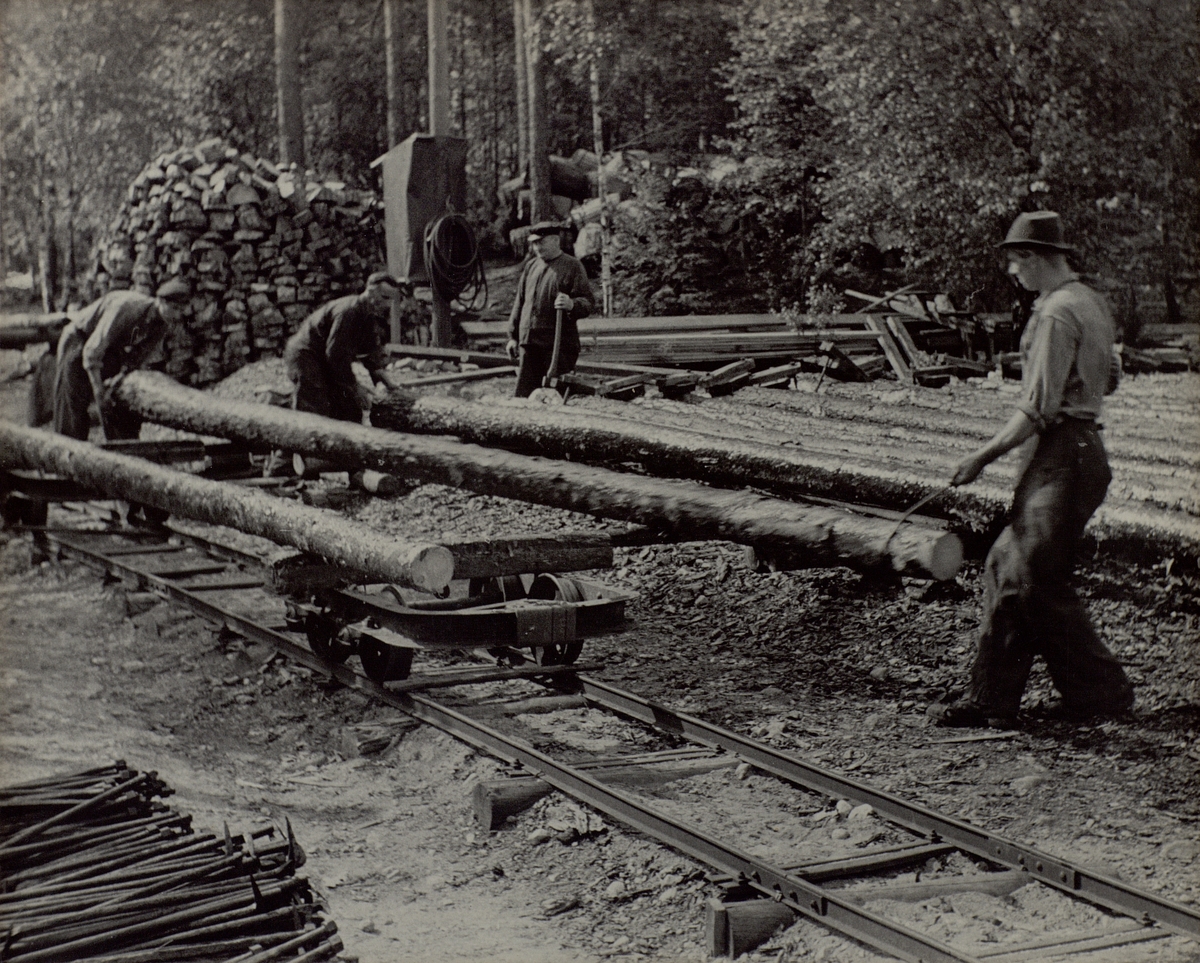 Björkhult Impregneringsanstalten. Bilden visar hur stolparna läggs på sina banor sedan de körts upp från vattnet på trallvagnarna.