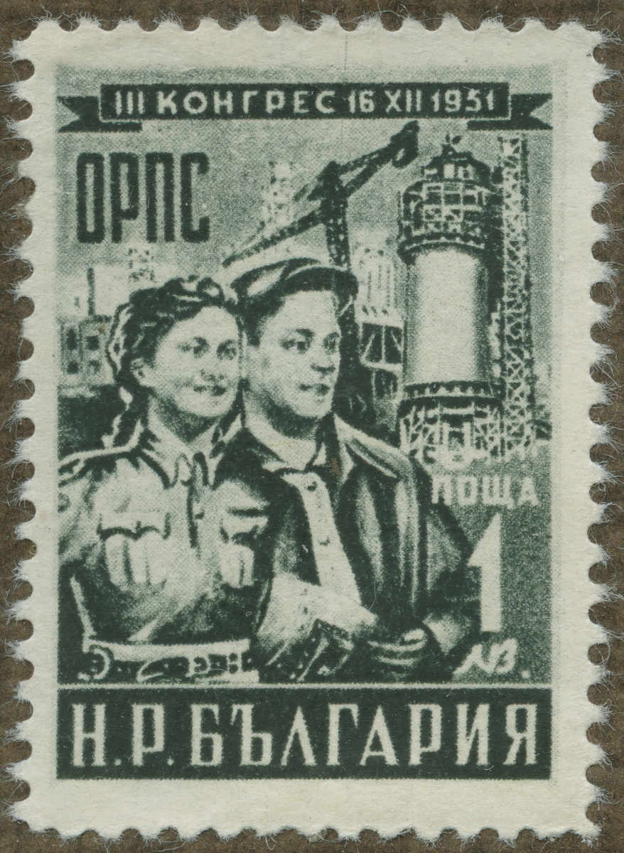 Frimärke från Bulgarien, 1951. Motiv av man och hustru vid uppbyggandet av Dimitrovgrad. "3:e kongressen för Arbetare: 16 december 1951".