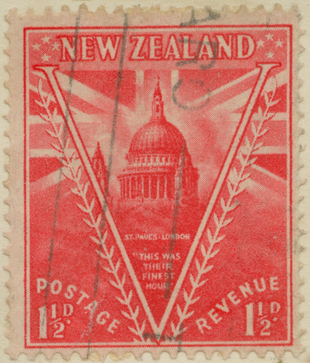 Frimärke från Nya Zeeland, 1946. Motiv av St. Paulskatedralen i London.