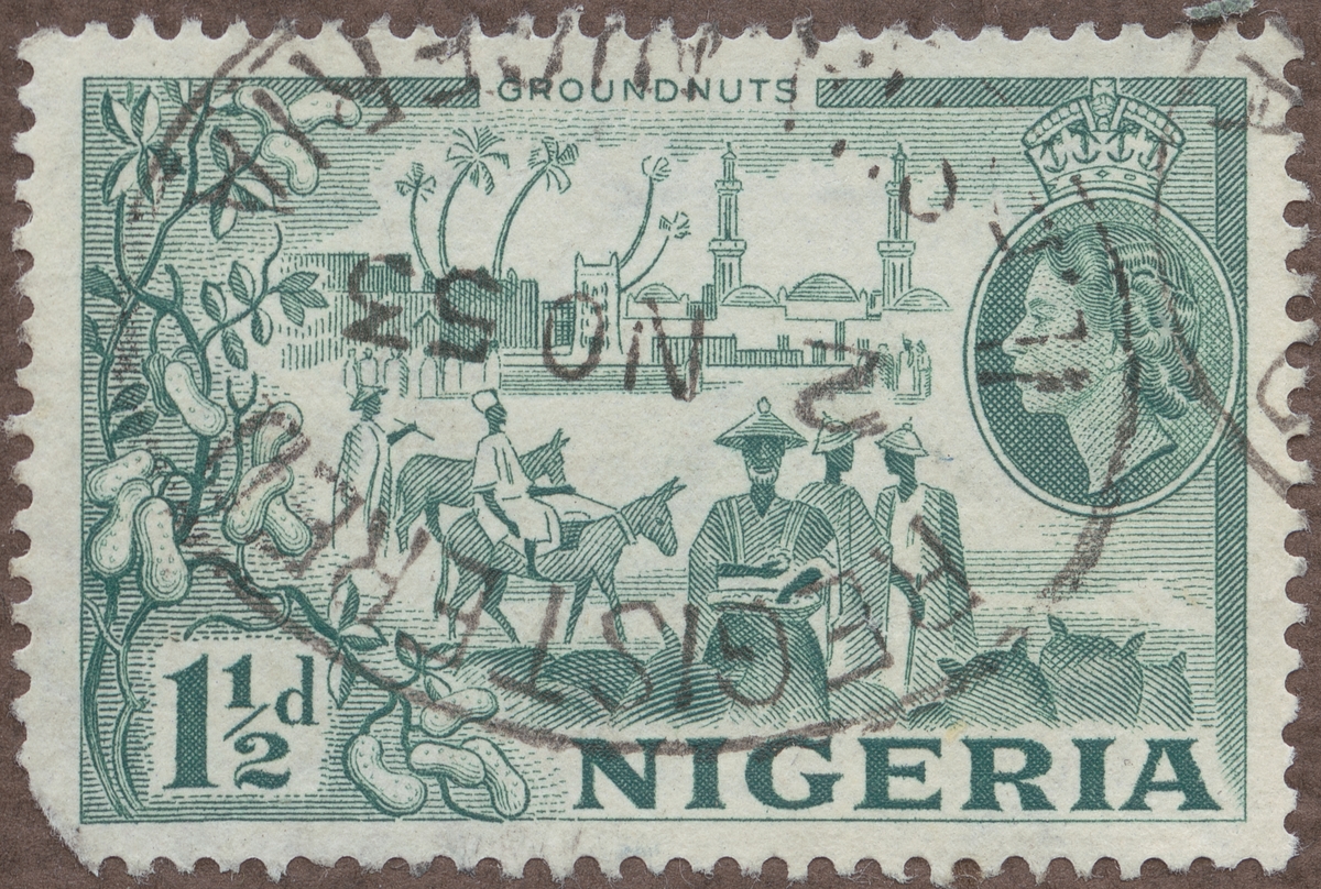 Frimärke från Nigeria, 1953. Motiv av skörd av jordnötter.