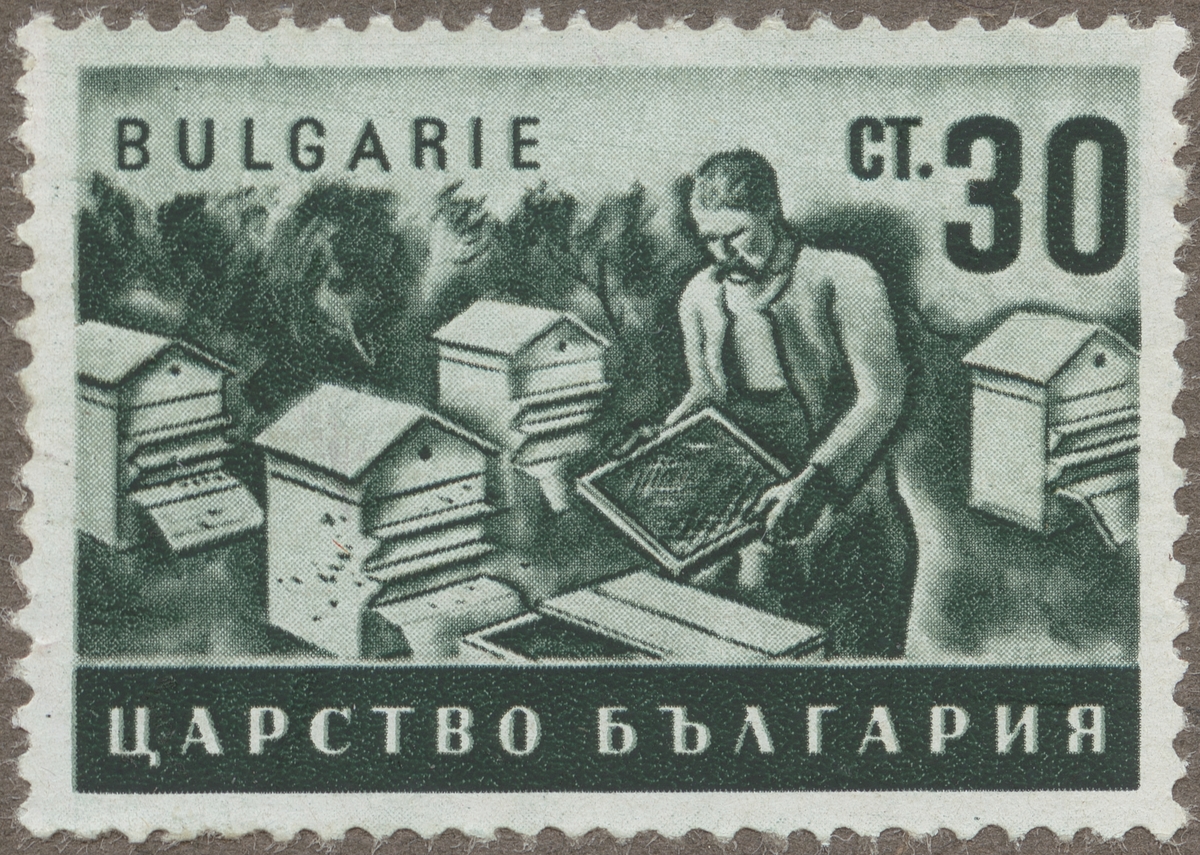 Frimärke från Bulgarien, 1941. Motiv av honungsskörd i Bulgarien. Bikupor tömmas.