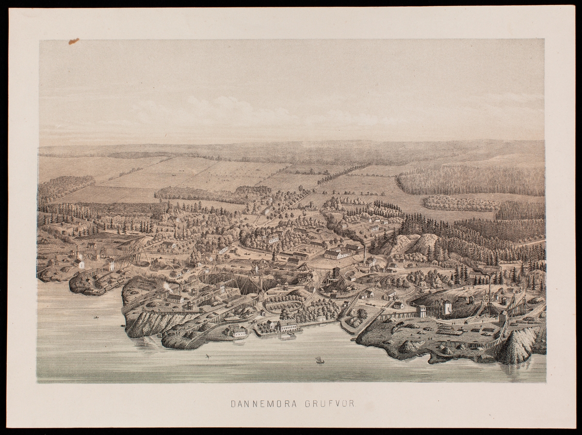Litografi. Tyckt bild med motiv av Dannemora gruvor.