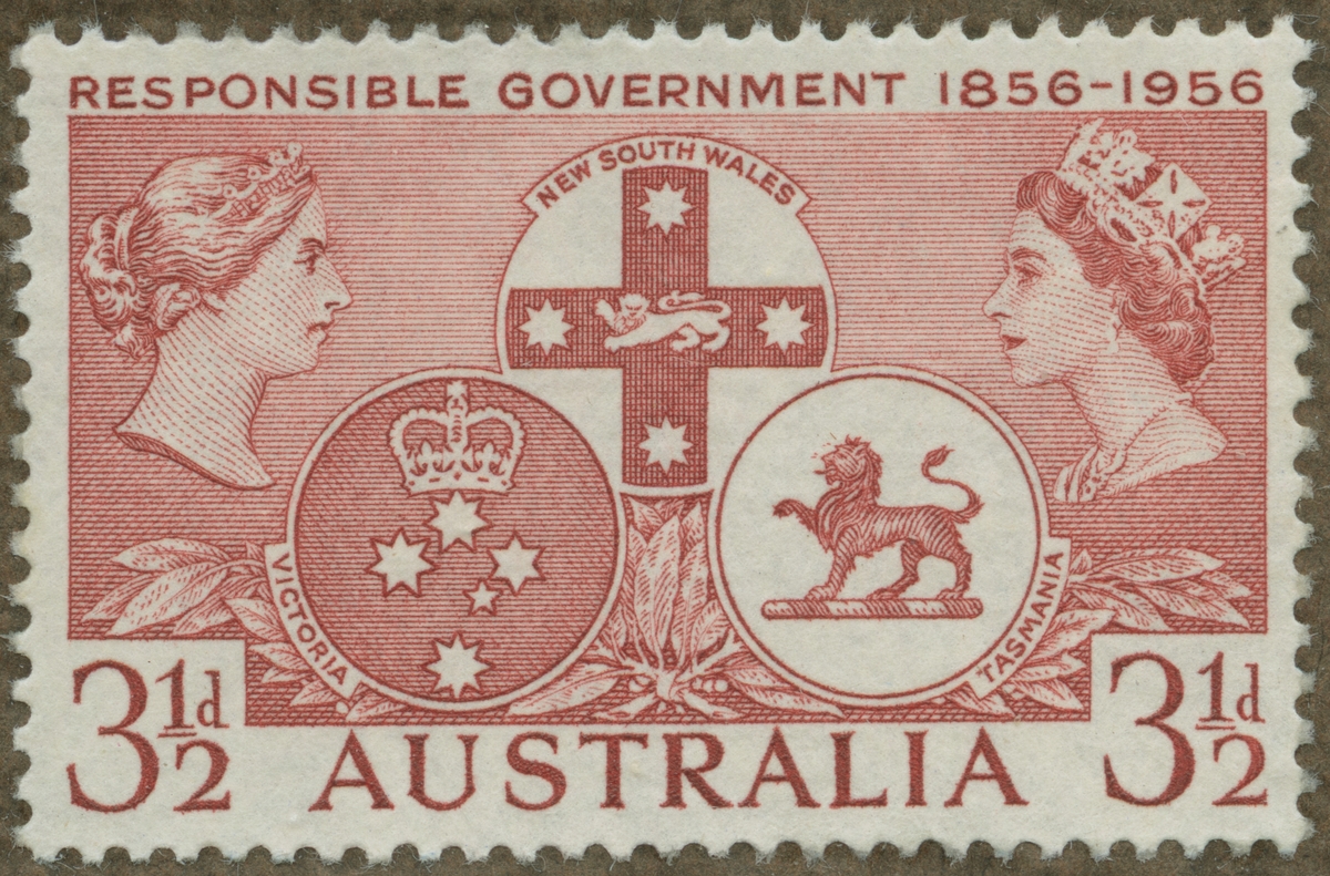 Frimärke ur Gösta Bodmans filatelistiska motivsamling, påbörjad 1950. Frimärke från Australien, 1956. Motiv av Stjärnbilden Södra Korset m.m. "100-årsminne av New South Wales, Victoria och Tasmania provinsernas införlivning med Brittiska Samväldet: 1856- 1956."