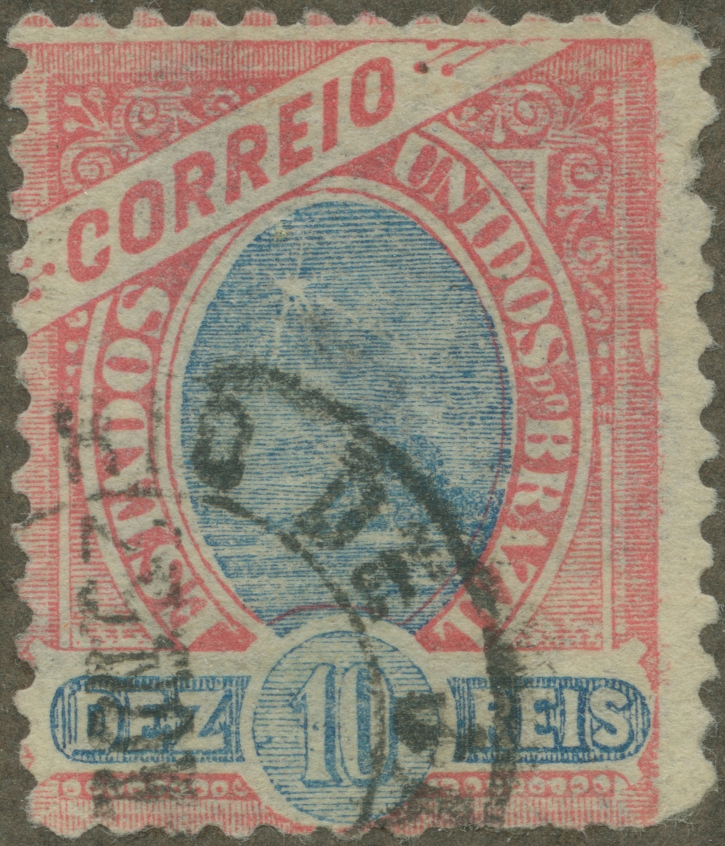 Frimärke ur Gösta Bodmans filatelistiska motivsamling, påbörjad 1950. Frimärke från Brasilien, 1894. Motiv av Strålande stjärna över brasilianskt landskap.