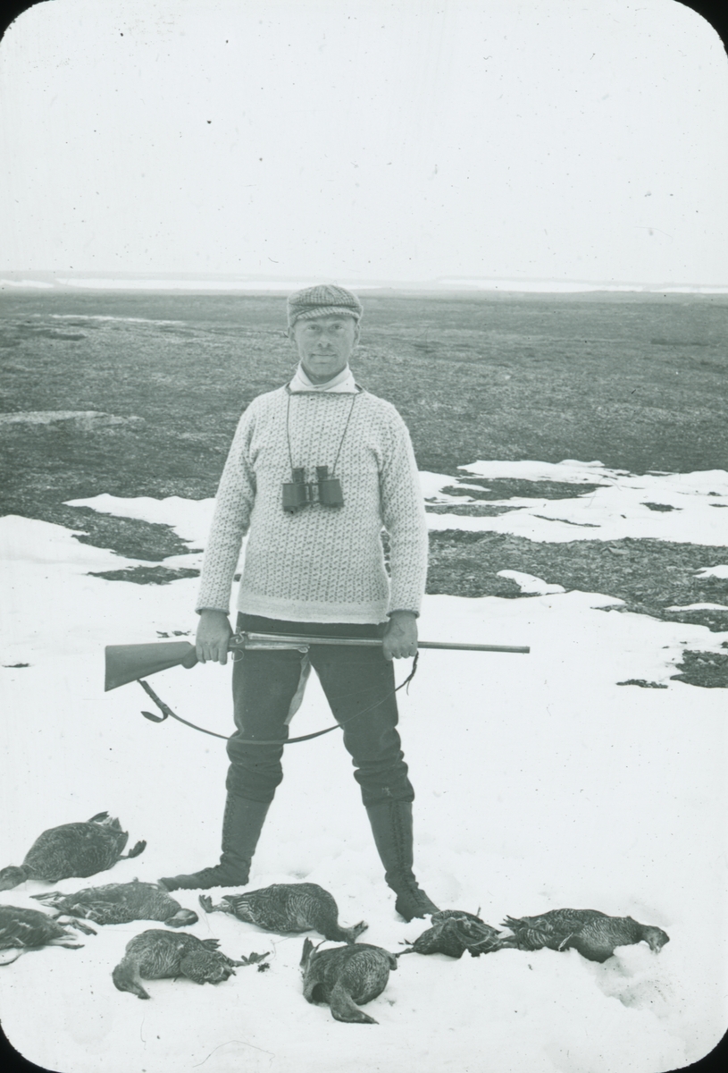 Fotografi från expedition till Spetsbergen. Motiv av man med gevär som skjutit ett antal fåglar.
