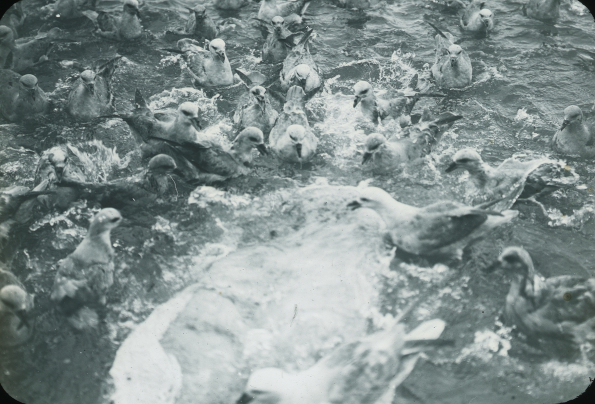 Fotografi från expedition till Spetsbergen. Motiv av fåglar som äter slaktavfall i havet.