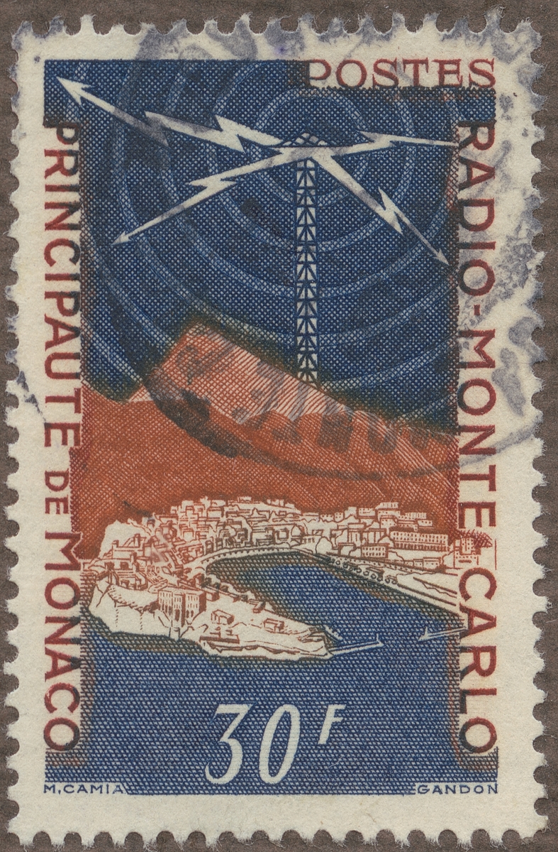 Frimärke ur Gösta Bodmans filatelistiska motivsamling, påbörjad 1950. Frimärke från Monaco, 1951. Motiv av Radiomasten i Monaco "-Monte Carlo-"