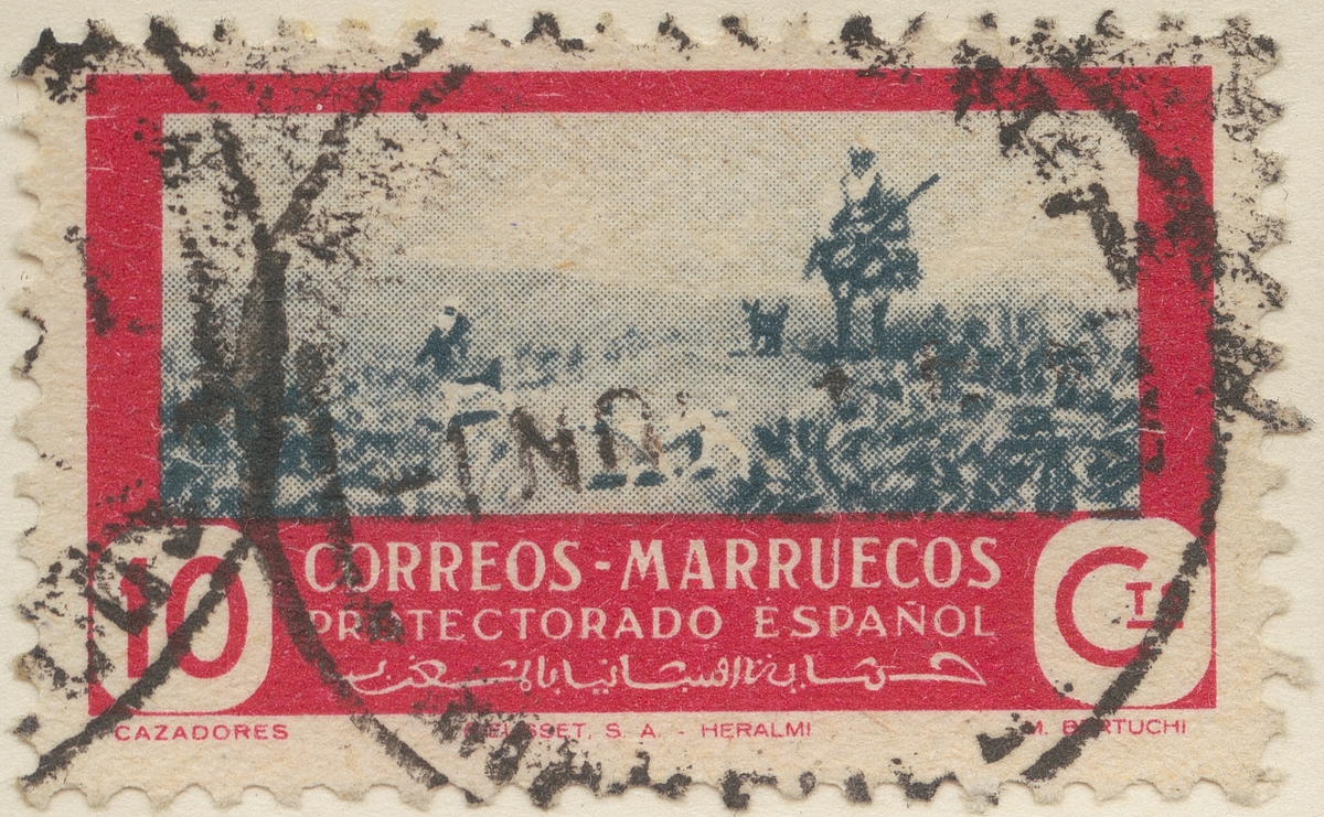 Frimärke ur Gösta Bodmans filatelistiska motivsamling, påbörjad 1950. Frimärke från Spanska Marocko, 1950. Motiv av Ridande jägare med hundar "-TBC-märke-"