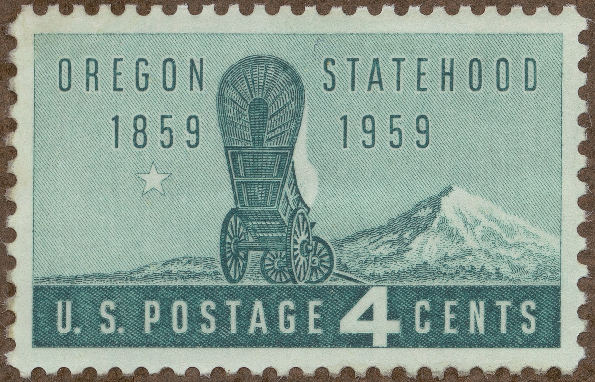 Frimärke ur Gösta Bodmans filatelistiska motivsamling, påbörjad 1950. Frimärke från U.S.A., 1959. Motiv av Typisk amerikansk utvandrarkärra ":- vanlig på "Oregon Trail". Oregon staten 100 år 1859-1959. (t.h.): Mount Hood."