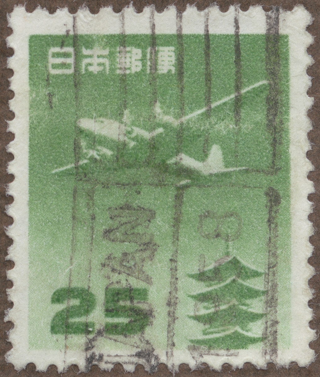 Frimärke från Japan, 1951. Motiv av 4-motorigt monoplan över pagod.