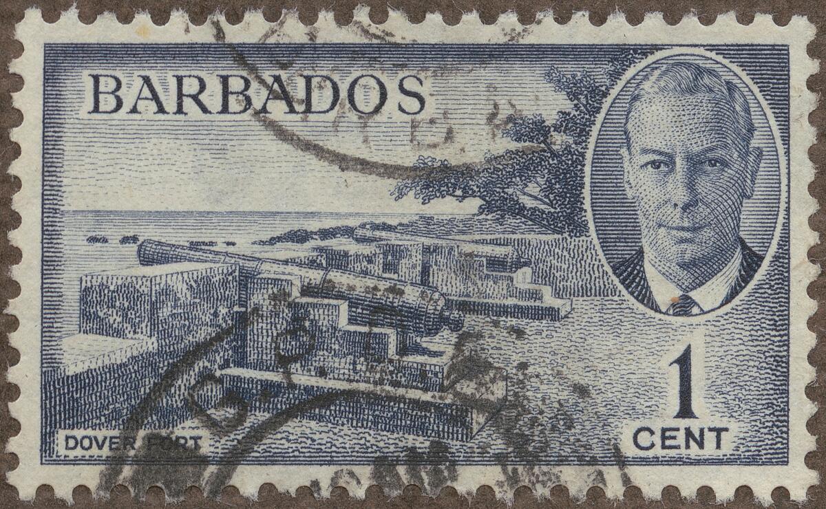 Frimärke från Barbados, 1950. Motiv av kanonbatteri: Fort Dover -Barbados- (t.h.): Kung George VI-
