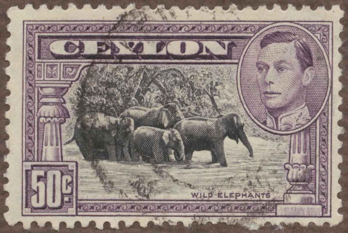 Frimärke från Ceylon, 1938. Motiv av Vilda elefanter badar (t.h.): Kung George VI-