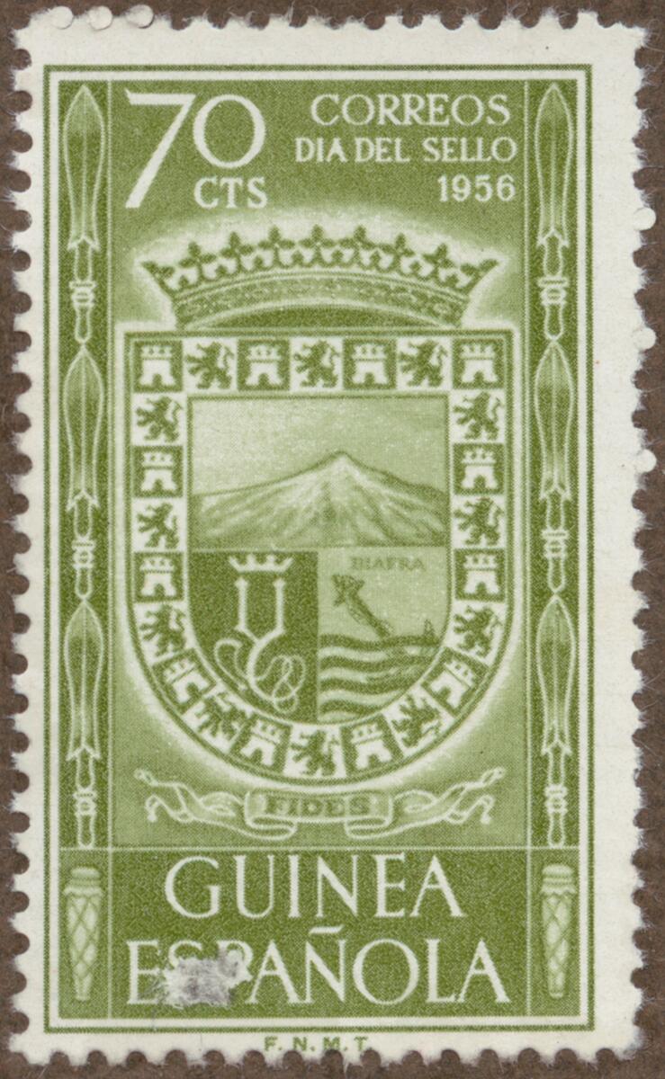 Frimärke från Spanska Guinea, 1956. Motiv av Landskapsvapen med sjömärke Frimärkets dag 1956