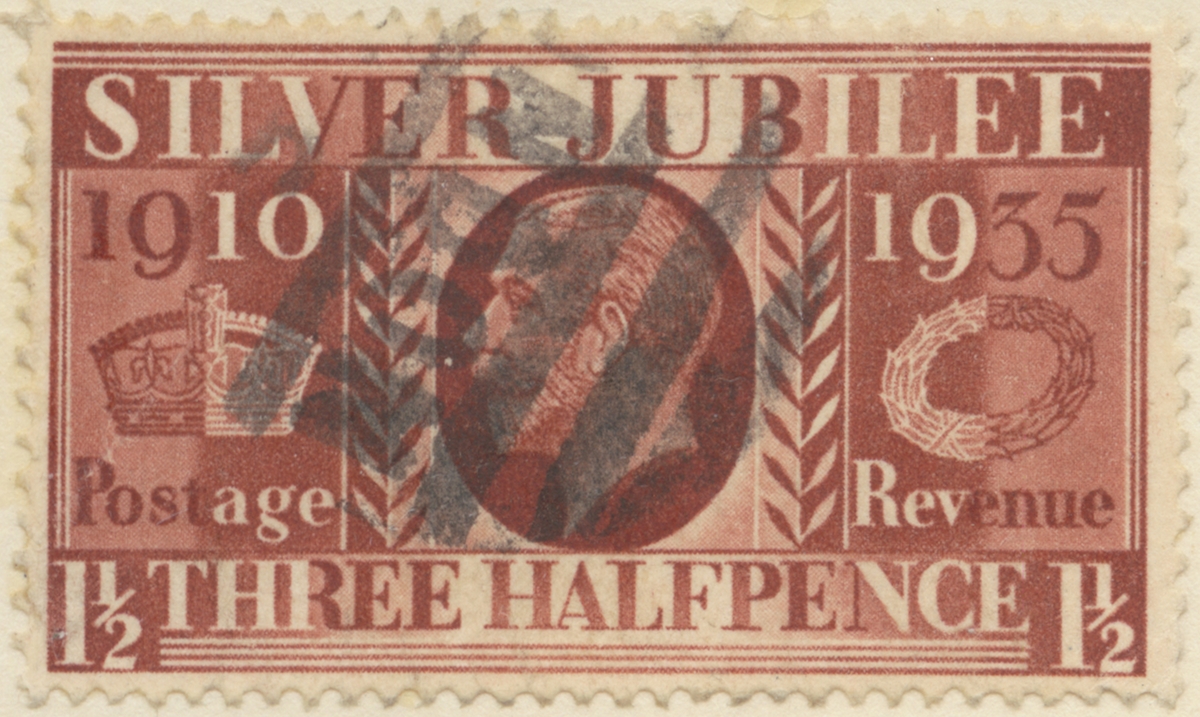Frimärke från England, 1935. Motiv av Krona och silverkrans. -Kung George V- -Minne av kungens 25-årsregerings jubileum: 1910-1935.