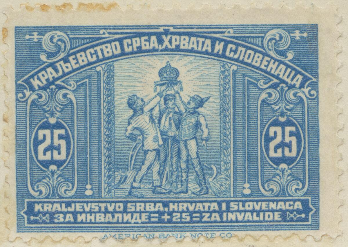 Frimärke från Jugoslavien, 1921. Motiv av Serbien, Kroatien och Slovenien hålla en gemensam krona "-Serie till förmån för krigsinvalider-"