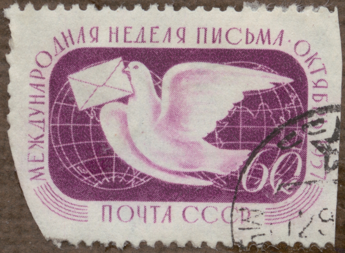 Frimärke från Ryssland, 1957. Motiv av Brevduva: Symbol flygpost -Till Brevens internationella vecka Oktober 1957.-