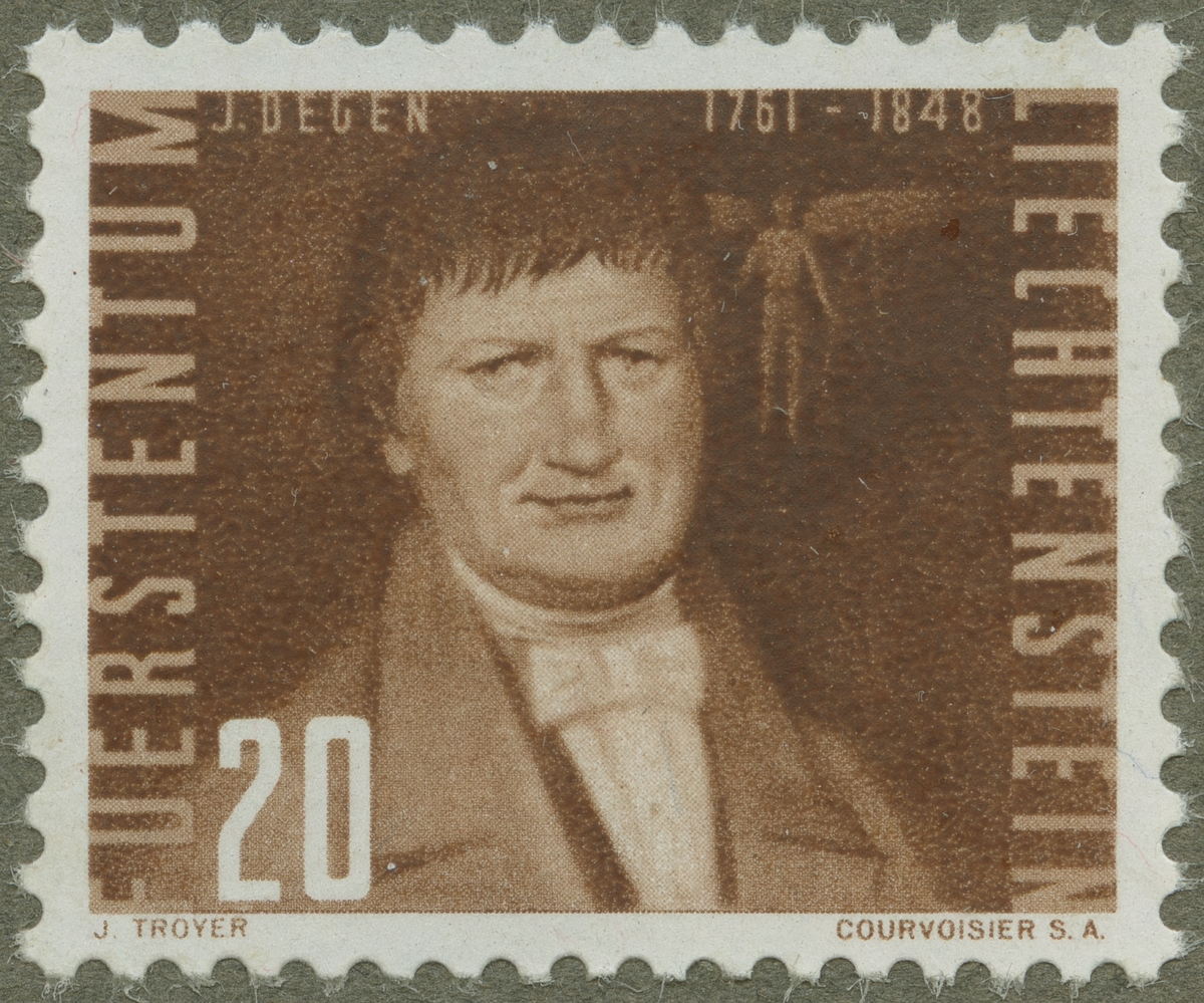 Frimärke från Liechtenstein, 1948. Motiv av Jacob Degen 1761-1848. Byggde åren 1805-10 en kombination mellan friballong och slagflygare. "Serie: Föregångsmän inom luftfarten."