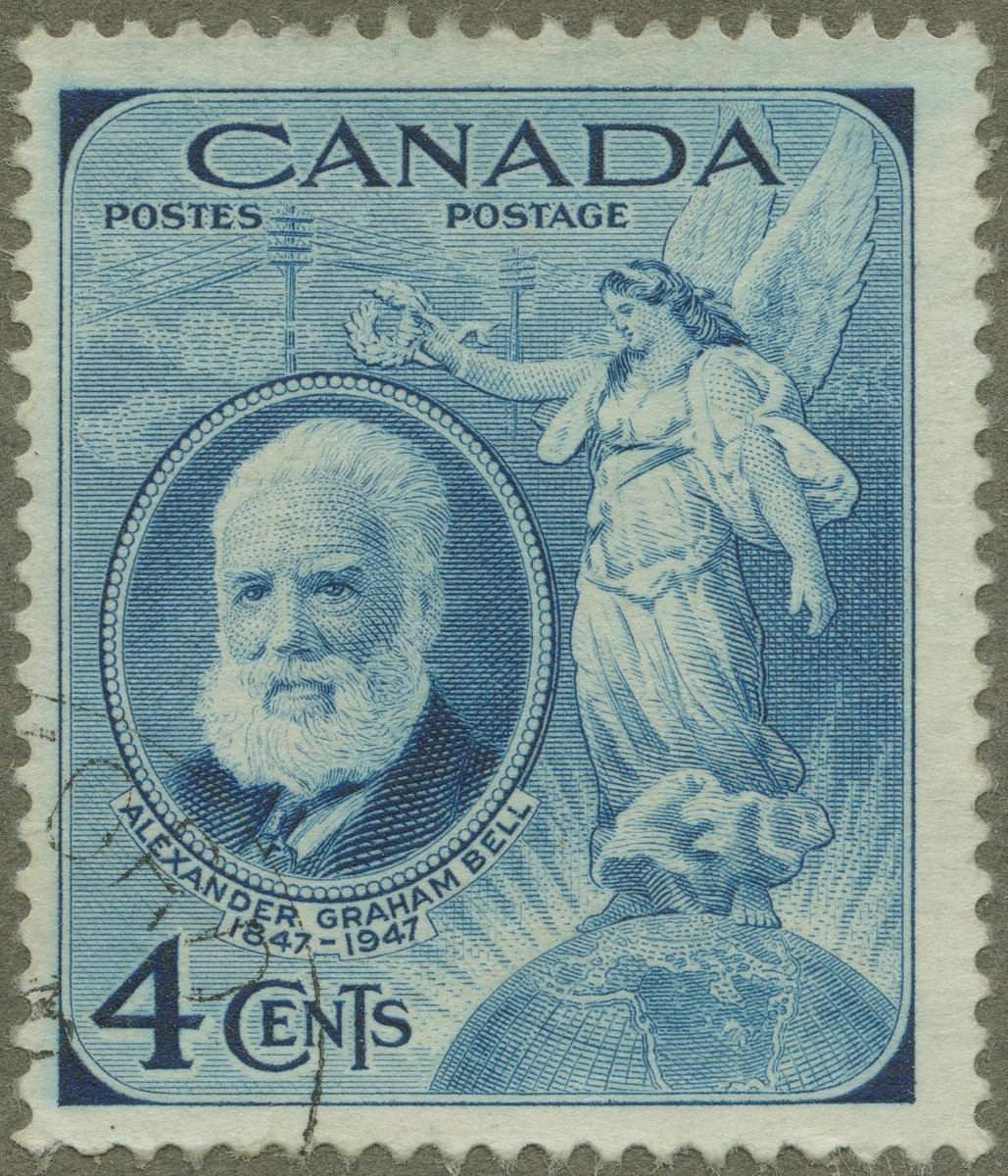 Frimärke från Canada, 1947. Motiv av Alexander Graham Bell 1847-1922. Född i Skottland överflyttad till Canada 1870. Professor i talfysiologi i Boston. 1876 patent på telefonen, 1880 på fotofonen. 100-årsminne av hans födelse. 1847-1947.