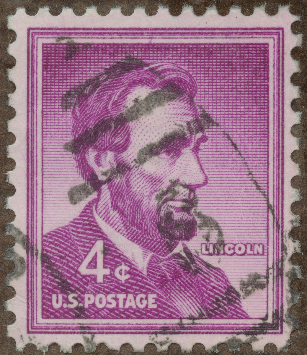 Frimärke från U.S.A., 1954. Motiv av Abraham Lincoln: 1809-1865 Postmästare Lantmätare Advokat Föreslog slaveriets avskaffande President: 1861-1865