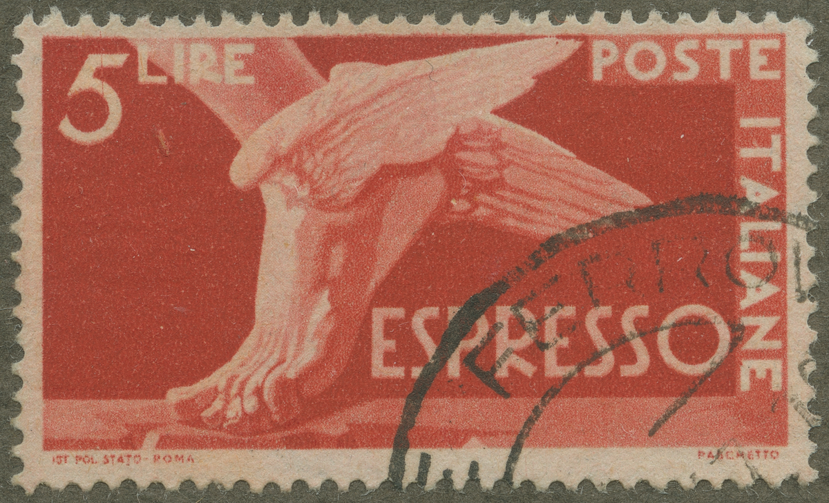 Frimärke från Italien, 1945. Motiv av Vingad Merkurius-fot Symbol för Express- befordran