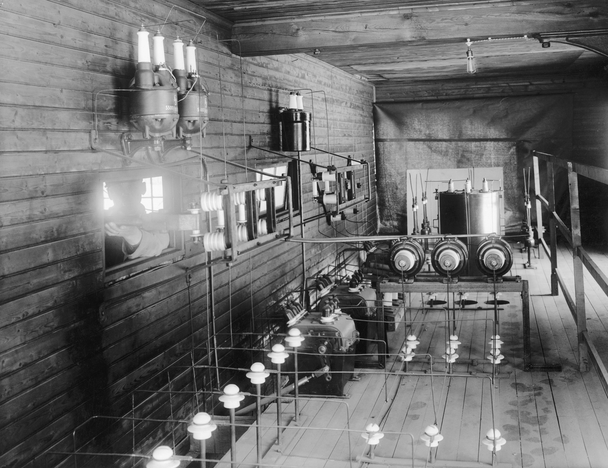 Sollefteå Stads Kraftverk före ombyggnaden åren 1933-1934. Övre avdelningen av högspänningsinstrumenteringen. Den mörka fläcken i vänstra träväggen är märke efter den ljusbåge som uppstått mellan fas och jordlina vid de tillfällen, då metallerna i de nedanför placerade porslinssäkerhetsapparaterna för de utgående linjerna avsmält. Den härvid uppkomna ljusbågen har slagit över till jordlinan, som är fastspikad i väggen.