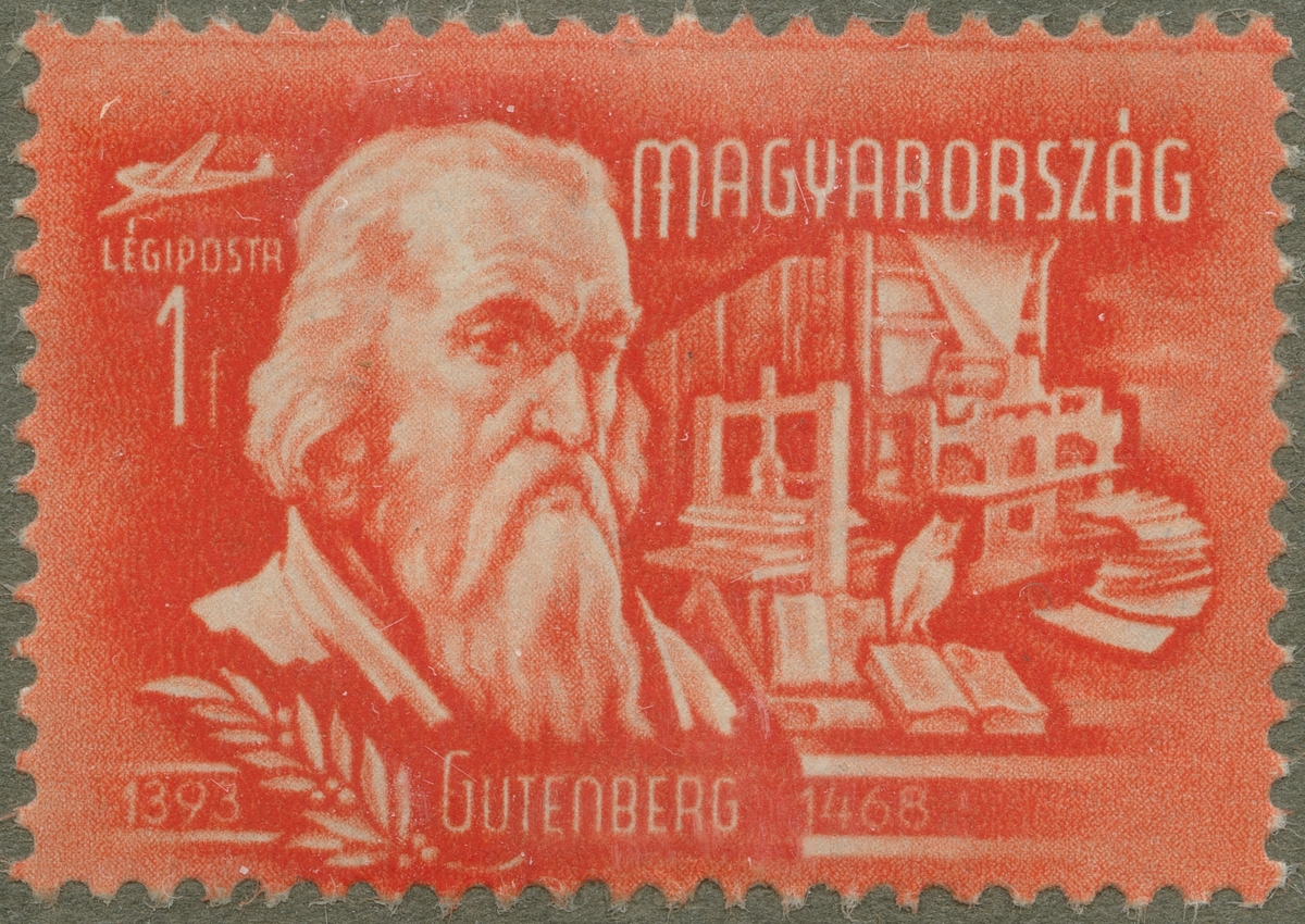 Frimärke från Ungern, 1948. Motiv av Johann Gutenberg, född mellan åren 1394-1399, död 1468.