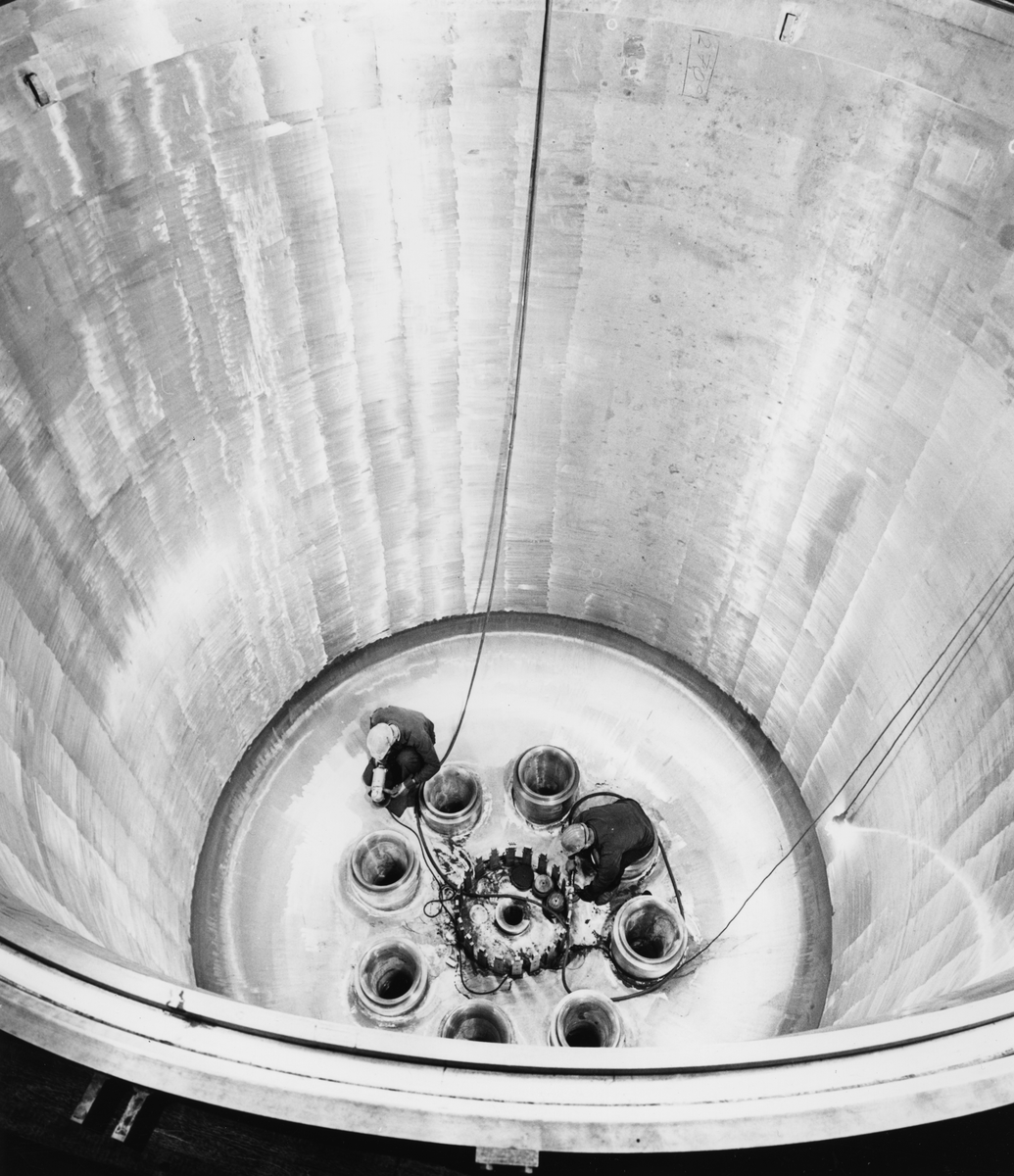 Sliparna Åke Antonsson (till vänster) och Göte Norman slipar före påbörjandet av det slutliga rengöringsarbetet bort resterna av de under tryckprovningen använda trådtöjningsgivarna. Den väldiga reaktortanken består invädigt av högvärdigt rostfritt stål, och man har minutiöst kontrollerat, att det inte finns en enda mikroskopisk spricka eller porositet i det fina ytskiktet.