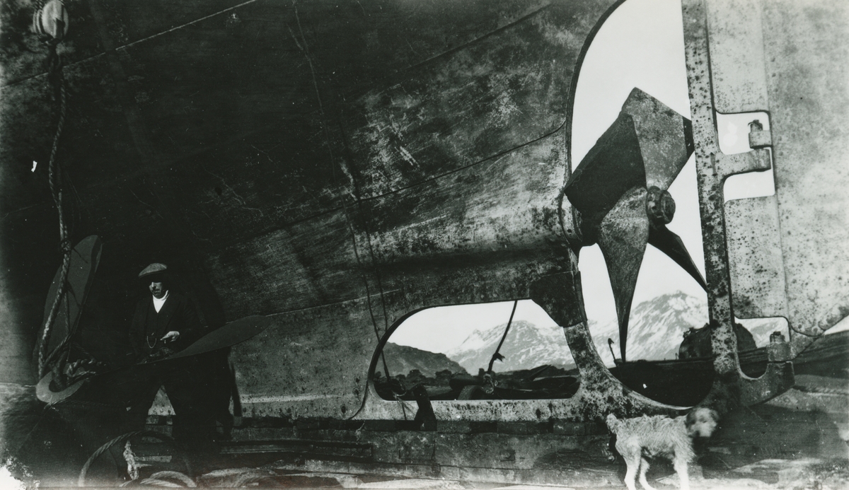Bild från expedition i Antarktisområdet. Motiv av man och hund som står bredvid fartyg på land.