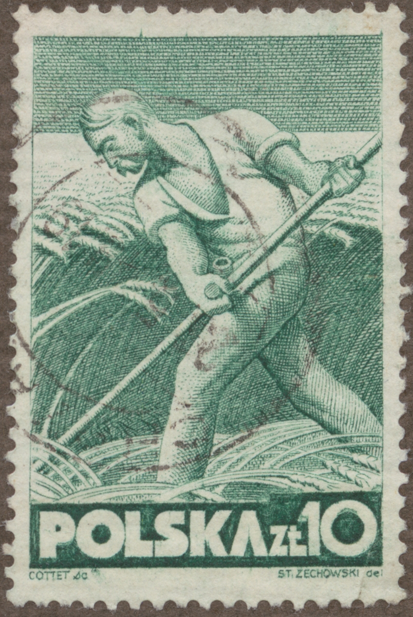 Frimärke från Polen, 1947. Motiv av Rågskörd med lie
