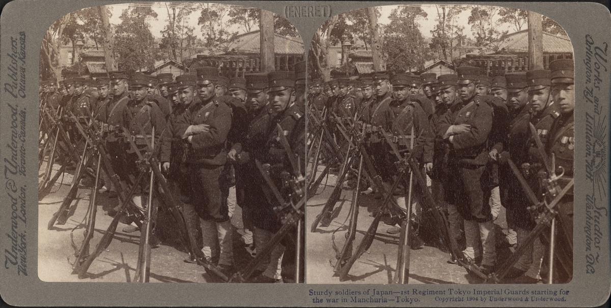 Stereobild av Japanska soldater, 1:a regementet, Tokyo Imperial Guards, förberedda för kriget i Manchurian.