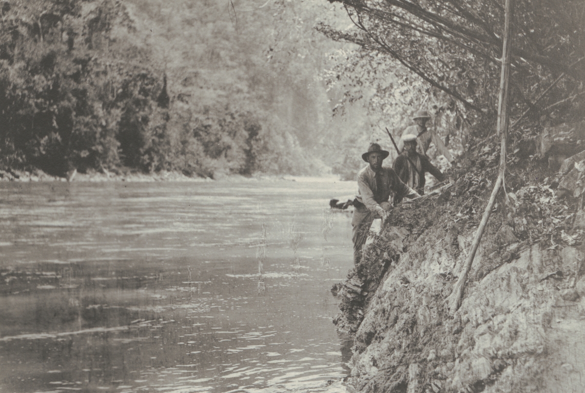 Fotografi från kuvert märkt med "Ernst Nordenskjöld". Motiv av tre expeditionsdeltagare vid flod i djungeln.