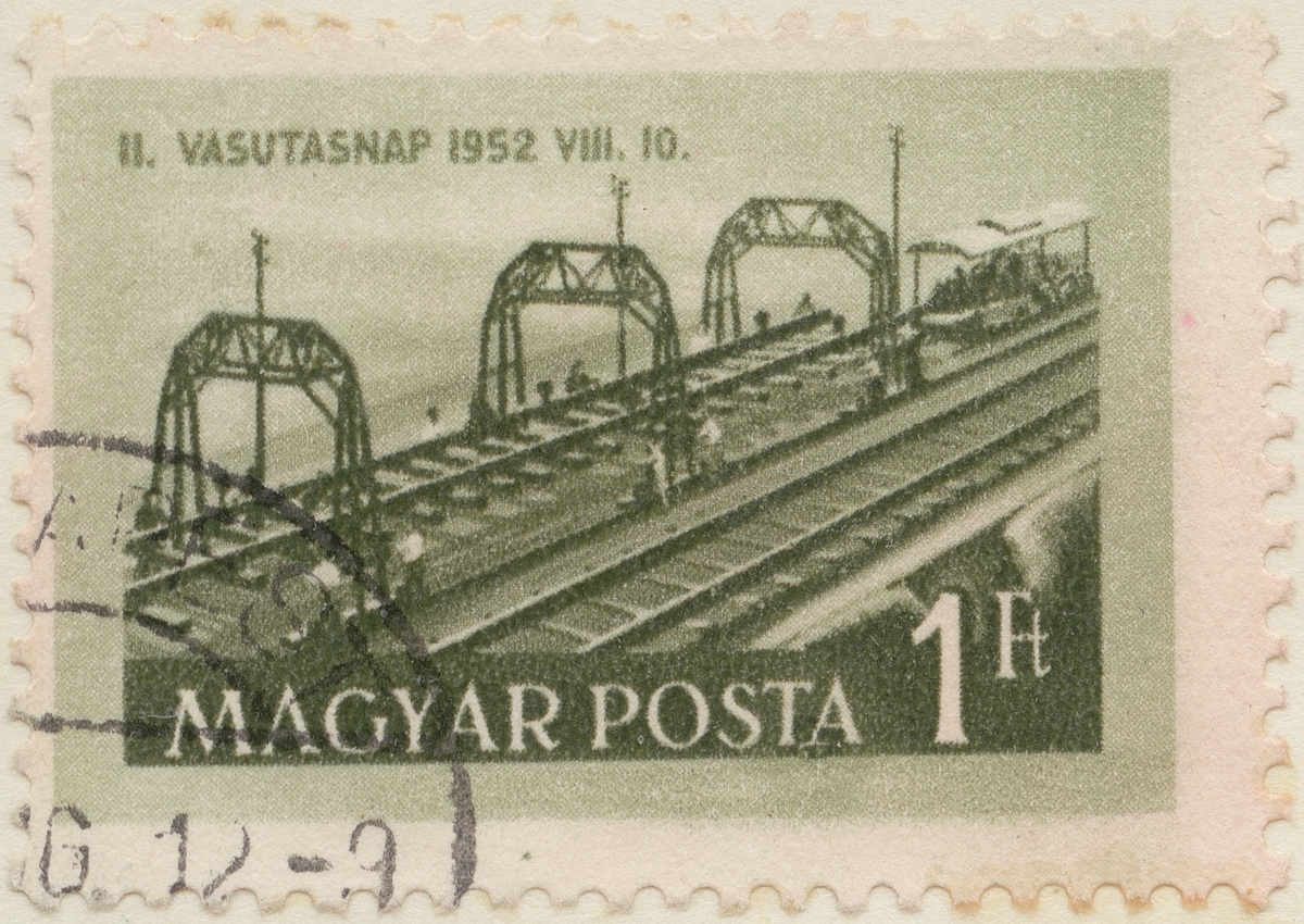 Frimärke ur Gösta Bodmans filatelistiska motivsamling, påbörjad 1950. Frimärke från Ungern, 1952. Motiv av Elektrifierad Bangård "-Propaganda för Järnvägens Dag: 10 augusti 1952."