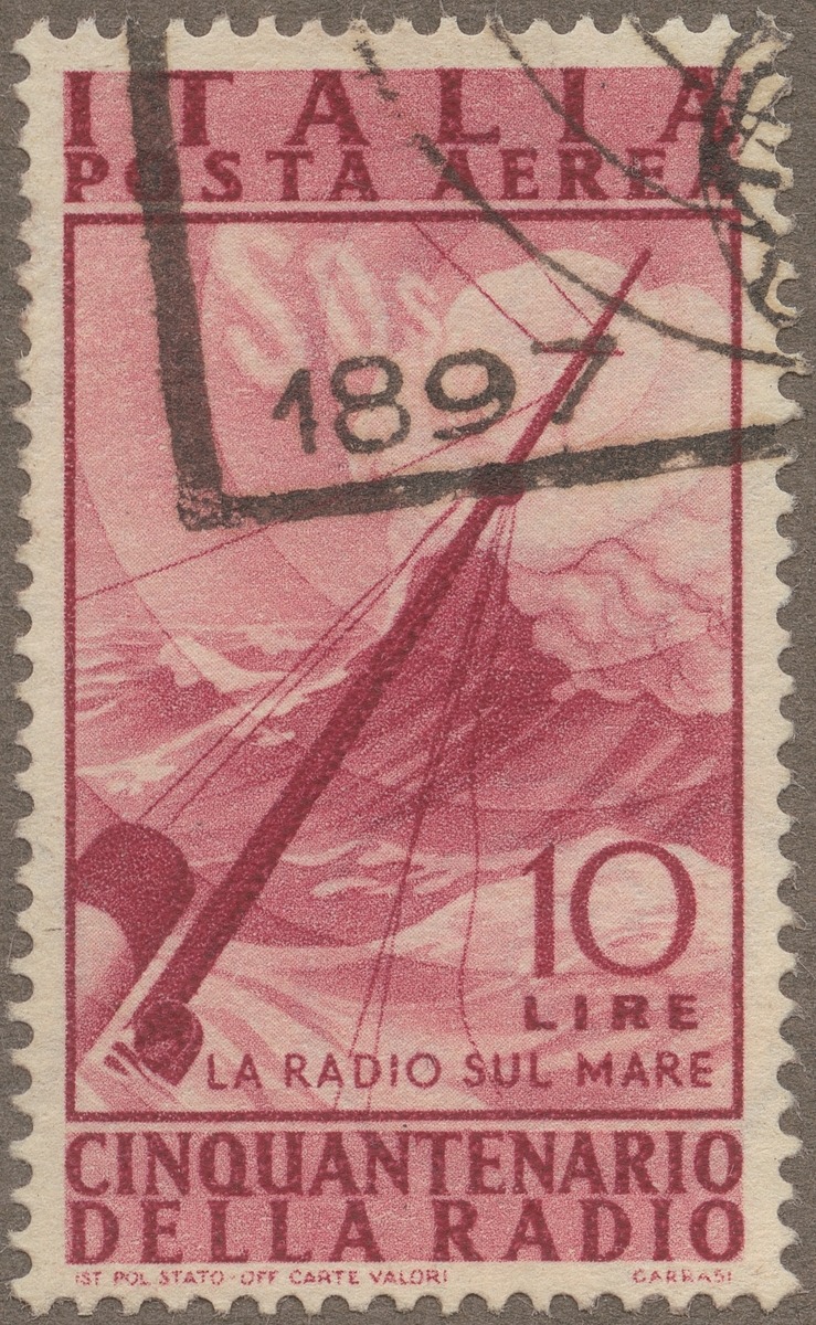 Frimärke ur Gösta Bodmans filatelistiska motivsamling, påbörjad 1950. Frimärke från Italien, 1947. Motiv av Italiensk fartygsradio utsändande signaler om hjälp "SOS". "50-årsminnet av radion i Italien."