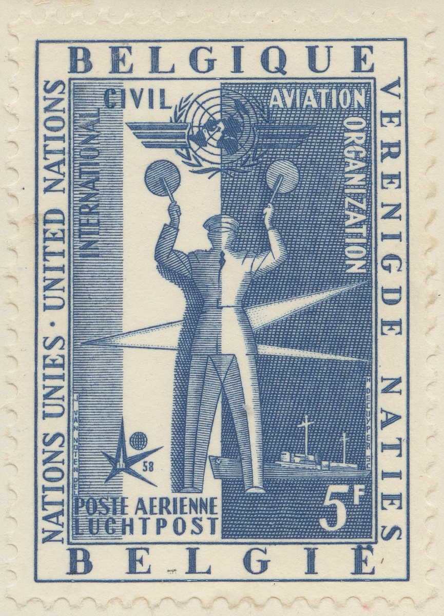 Frimärke från Belgien, 1958. Motiv av Civil Luftfarts Organisation Bryssel Utställningen 1958. "FN- Serie"